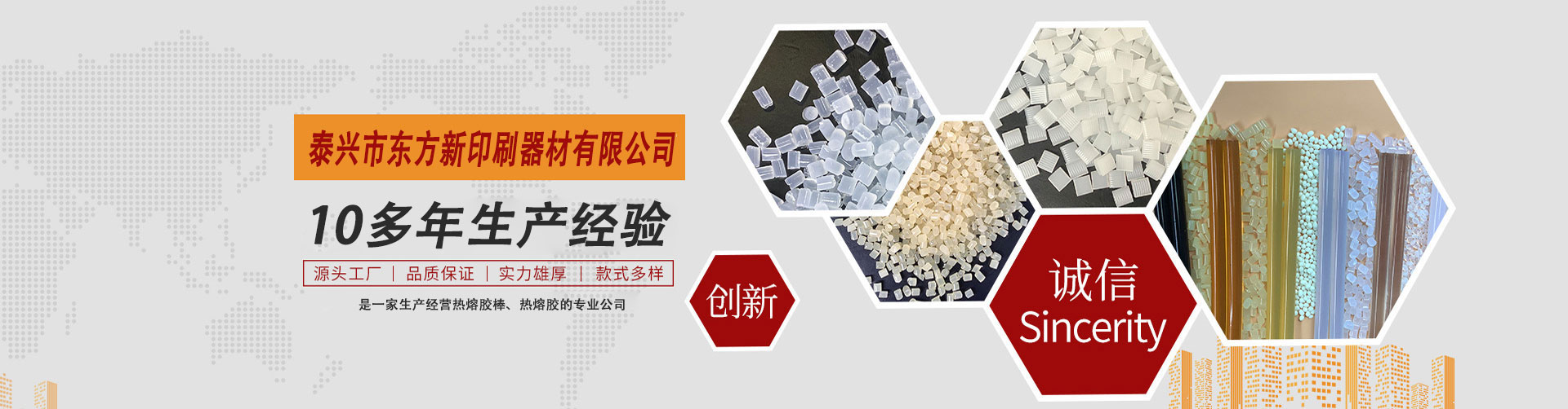 泰興市東方新印刷器材有限公司是專(zhuān)一生產(chǎn)綠色環(huán)保型印刷裝訂書(shū)刊熱熔膠,封箱包裝熱熔膠,吸管膠,鞋材熱熔膠,冰箱熱熔膠,熱熔膠棒,地毯背膠等。產(chǎn)品具有快速粘接、耐老化、強(qiáng)度高、熱穩(wěn)定性好、無(wú)毒害等優(yōu)點(diǎn),廣泛用于無(wú)線膠訂、自動(dòng)化封箱,飲料吸管粘結(jié)接,電子電器、工藝品、玩具、家具等領(lǐng)域,公司與多家科研機(jī)構(gòu)建立了緊密的戰(zhàn)略合作關(guān)系,質(zhì)量達(dá)到先進(jìn)水平,產(chǎn)品已銷(xiāo)往全國(guó)30多個(gè)省市地區(qū),并出品到東南亞多個(gè)國(guó)家和地區(qū)。    公司堅(jiān)持“誠(chéng)信為本,貼心服務(wù)”為廣大顧客提供優(yōu)質(zhì)產(chǎn)品,董事長(zhǎng)兼總經(jīng)理黃衛(wèi)東先生攜全體員工,竭誠(chéng)歡迎各界朋友光臨指導(dǎo)、洽談合作、共贏同發(fā)展。    Taixing Dongfang New Printing Equipment Co., Ltd. specializes in the production of green and environmentall…